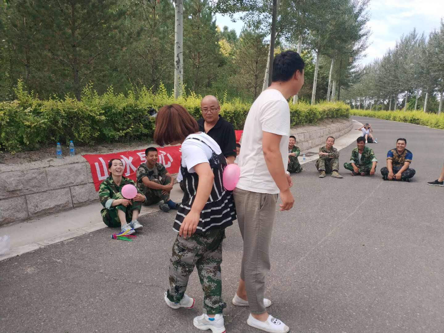 早上8點到黃河樓后,我們對18名新學員進行了分組,將隊員分成兩支隊伍,由隊長組織進行游戲。在隊長的帶領下,各隊隊員精誠合作,相互支持,先后進行了“跳繩比賽”、“個人跳繩比賽”、“斗牛比賽”“背對背運氣球比賽”“拔河比賽”、“俯臥撐比賽”等拓展項目。